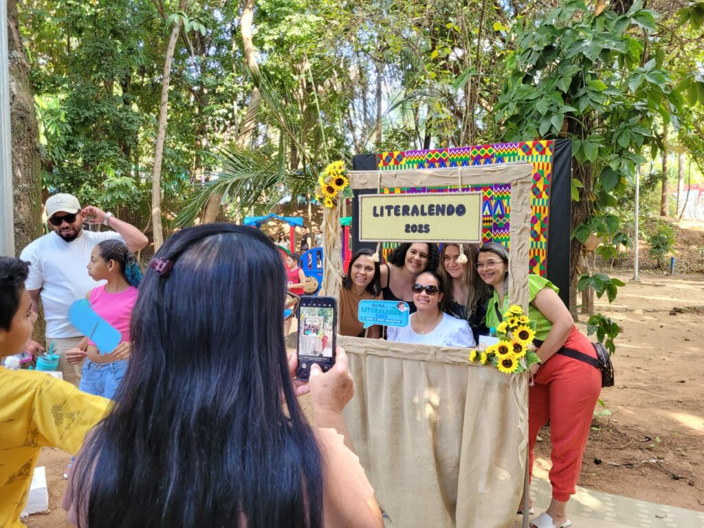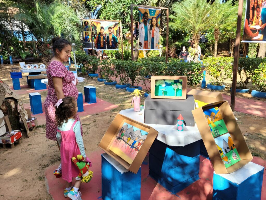 Além do cantinho da foto, outro ponto de destaque foi a exposição “Varal étnico ancestral”, com 30 trabalhos autorais, feitos por professores de Arte da rede municipal de educação. Os panôs artísticos, feitos sobre algodão cru, com uso de tinta, sementes, miçangas e acabamentos manuais, estavam pendurados como em um varal, entre as árvores. As obras, que buscam promover o letramento racial e a aplicação da Lei 11.645/08, expressam a ancestralidade, a diversidade e a força cultural dos povos originários e afrodescendentes. A lei estabelece o ensino da história e da cultura afro-brasileira e indígena nas escolas.
