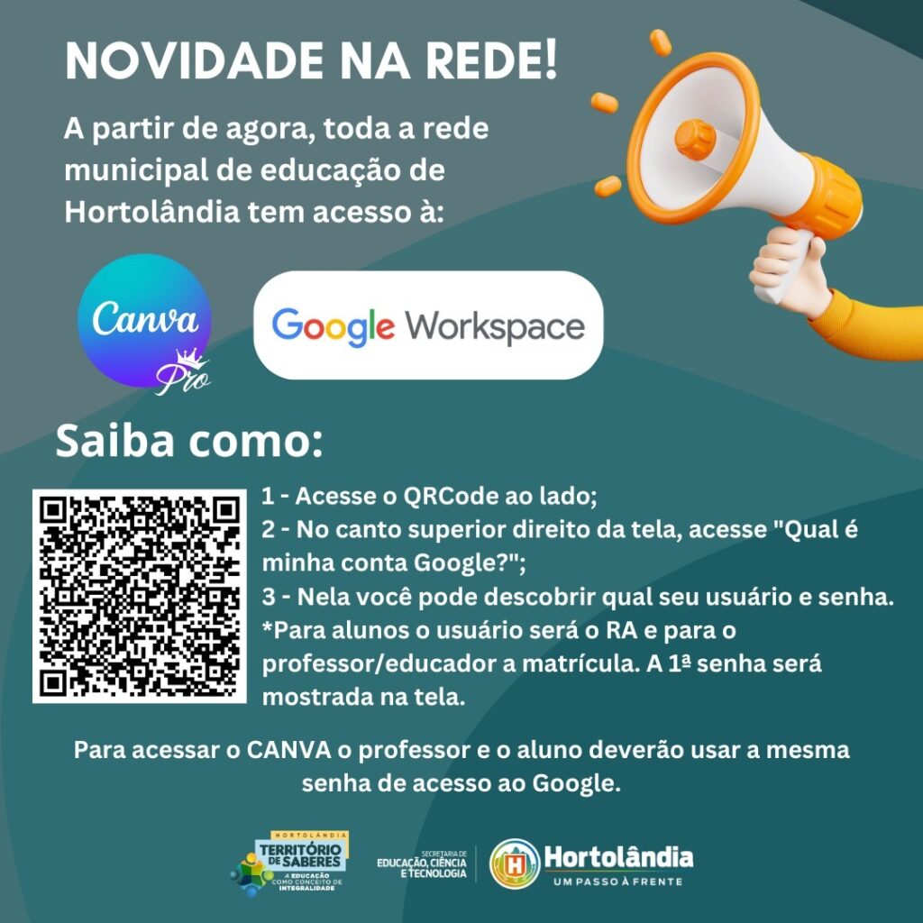 A partir de agora, todos os profissionais da rede municipal de ensino de Hortolândia passam a contar com acesso gratuito às plataformas “Canva Educacional” e “Google Workspace for Education”, duas das ferramentas digitais com recursos importantes para auxiliar e serem utilizadas no contexto educacional contemporâneo. A iniciativa é da Prefeitura, por meio da Secretaria de Educação, Ciência e Tecnologia.