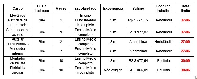 Há ainda oportunidades para mecânico eletricista de automóveis (uma vaga), auxiliar administrativo (duas vagas) e vendedor interno (duas vagas). PCDs (pessoas com deficiência) também podem concorrer a todos esses cargos, com exceção ao cargo de mecânico eletricista de automóveis.