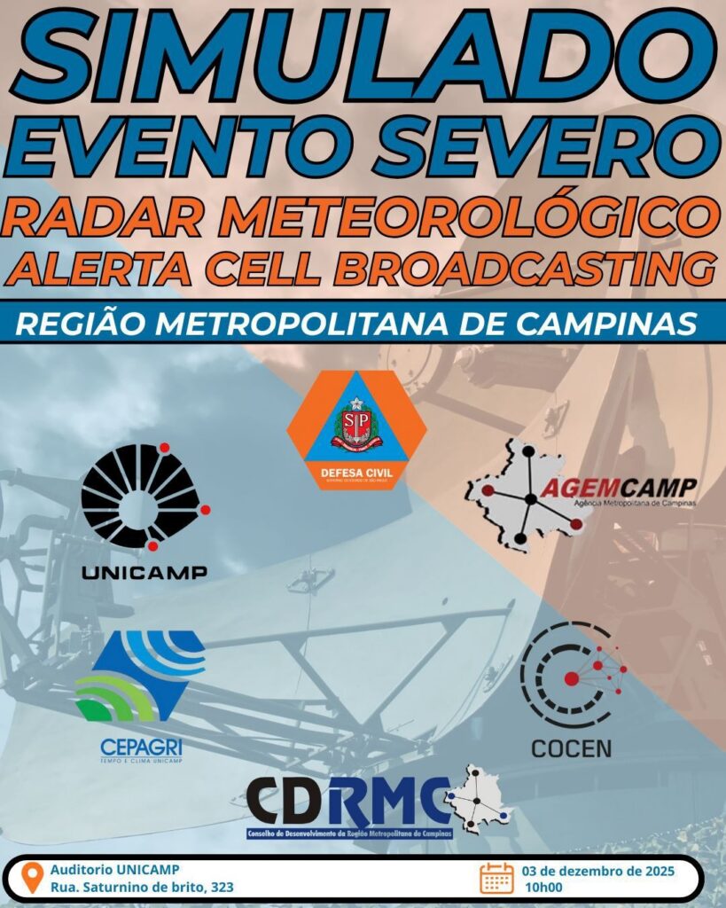 Neste horário, no Auditório da Unicamp, na Cidade Universitária, em Campinas, haverá um evento de apresentação do funcionamento do novo Radar Meteorológico e a simulação de um evento climático extremo, com envio teste do Sistema Cell Brodcasting (transmissão via celular) aos munícipes residentes em algumas áreas de risco dos 20 municípios da RMC. Também será feita a entrega das senhas de acesso aos dados meteorológicos aos prefeitos municipais.