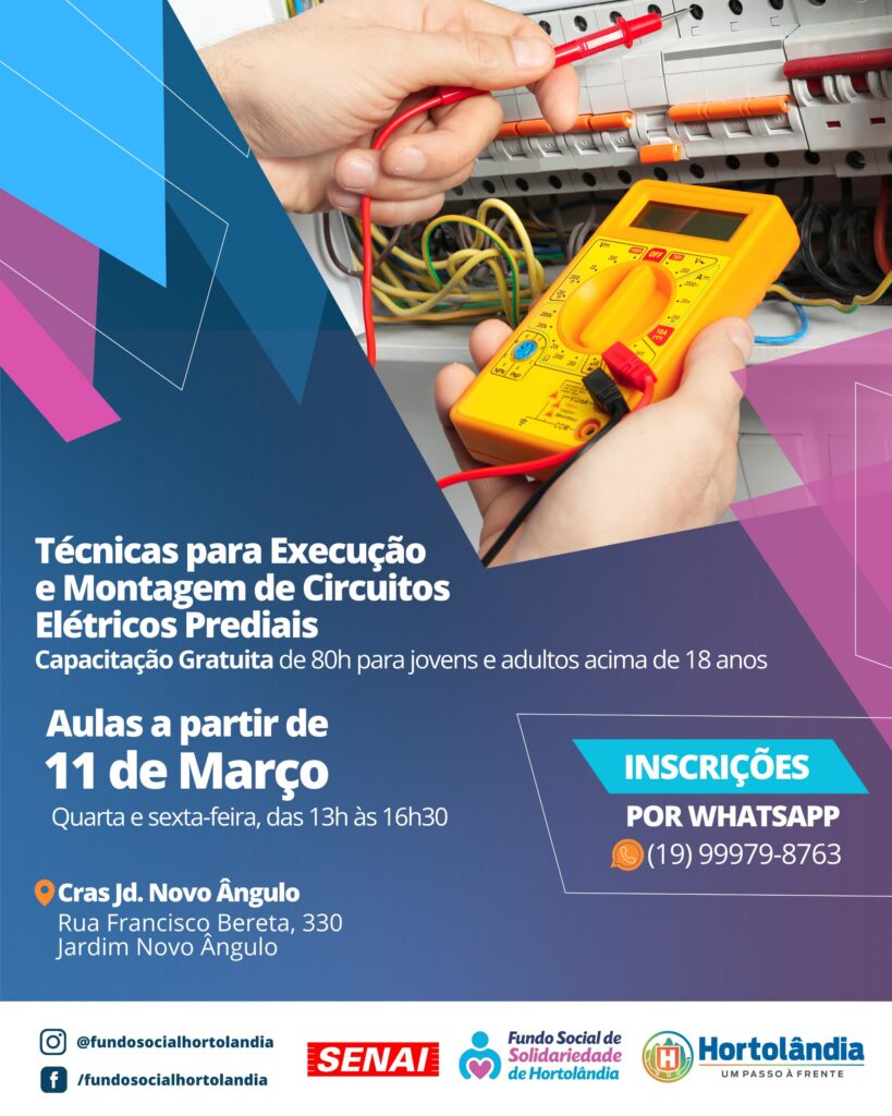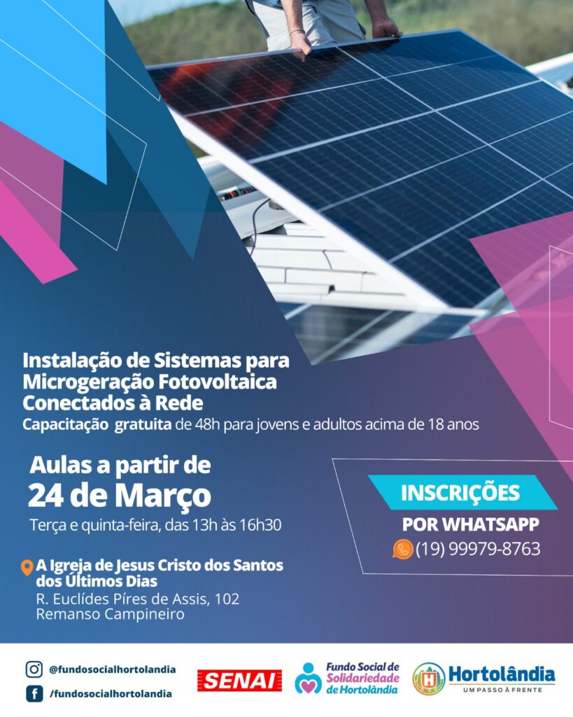 O FunSol (Fundo Social de Solidariedade) de Hortolândia abriu inscrições para três cursos presenciais e gratuitos. Dois deles serão ministrados por profissionais do Senai (Serviço Nacional de Aprendizagem Industrial): “Aperfeiçoamento Profissional em Técnicas para Execução e Montagem de Circuitos Elétricos Prediais” e “Instalação de Sistemas para Microgeração Fotovoltaica Conectados à Rede”. O terceiro, “Instalação de Película Automotiva (Insulfilm)”, será em parceria com a Escola do Mecânico.