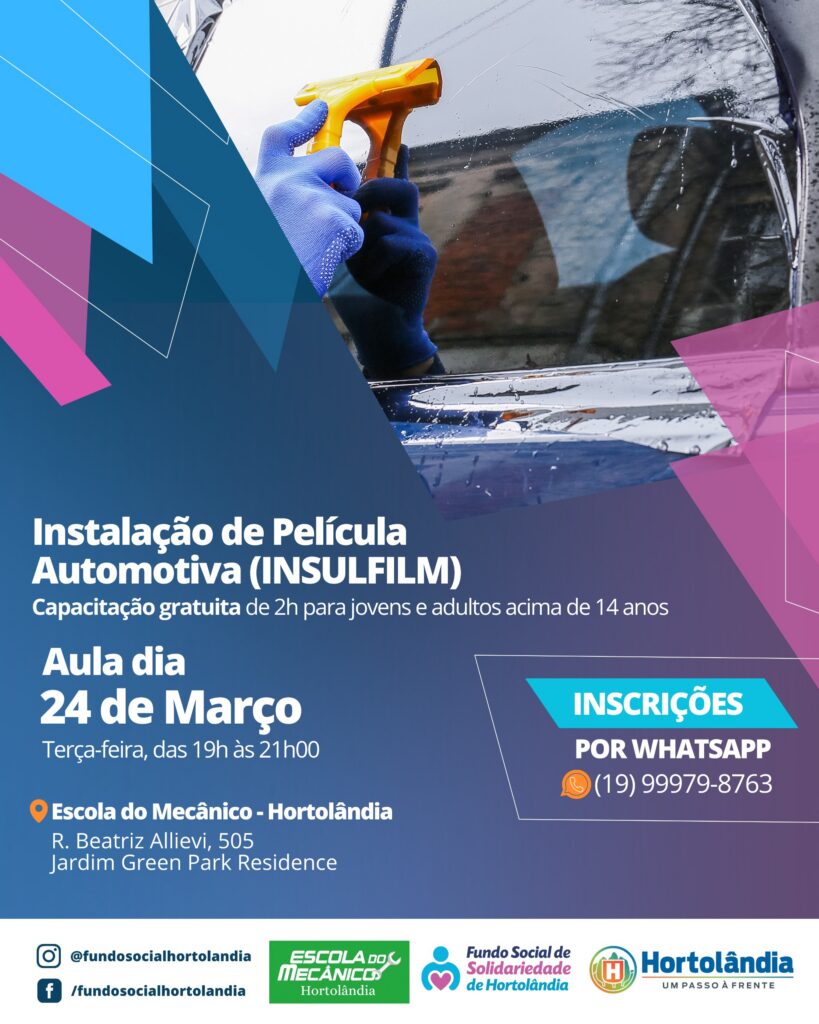 Nos dois primeiros, há 25 vagas disponíveis. Já no de Insulfilm, há 30 vagas. Os cursos são voltados a jovens e adultos que moram em Hortolândia. Interessados poderão se inscrever até a data de início do curso.