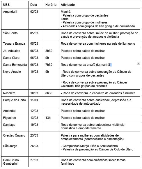Programação do Mês da Mulher nas UBSs:
