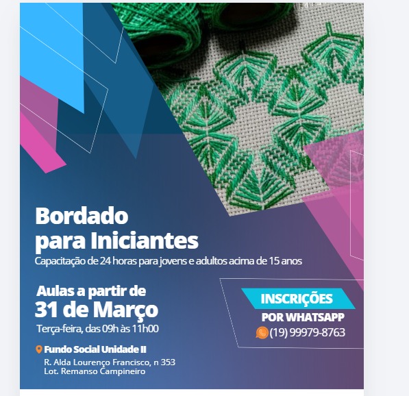 O FunSol (Fundo Social de Solidariedade) de Hortolândia está com inscrições abertas para dois cursos presenciais, voltados a quem gosta de artes manuais e quer aprender do zero. São eles: “Bordado em vagonite para iniciantes” e “Crochê para iniciantes”.