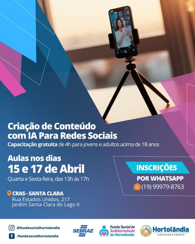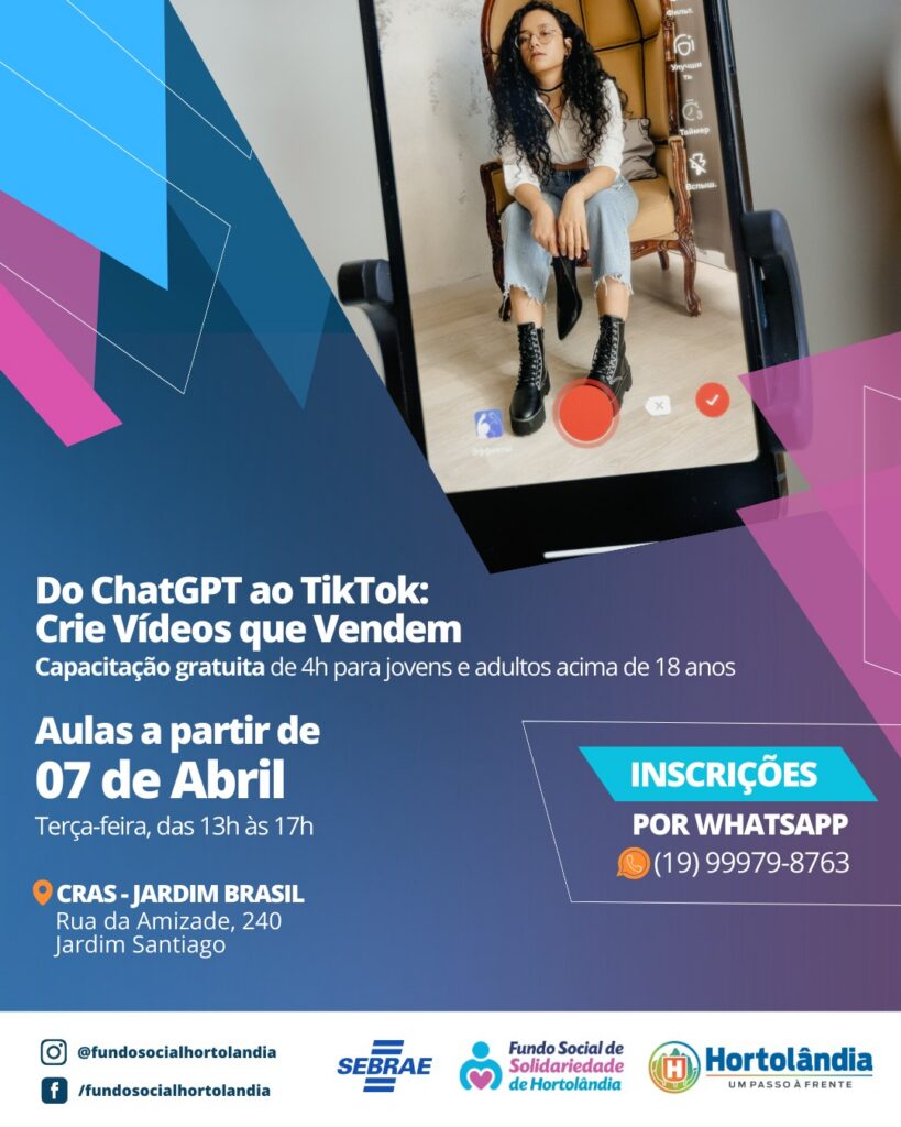 Conteúdo: Formação em parceria com o Sebrae, que ensinará como utilizar ferramentas digitais e de inteligência artificial para criar conteúdos e se comunicar melhor no ambiente online. Os participantes aprendem a usar o ChatGPT para gerar ideias, textos e roteiros, além de explorar o TikTok como plataforma para produzir e compartilhar conteúdos de maneira criativa. O objetivo é desenvolver habilidades digitais, estimular a criatividade e mostrar como a tecnologia pode abrir novas oportunidades de comunicação, aprendizado e até geração de renda.