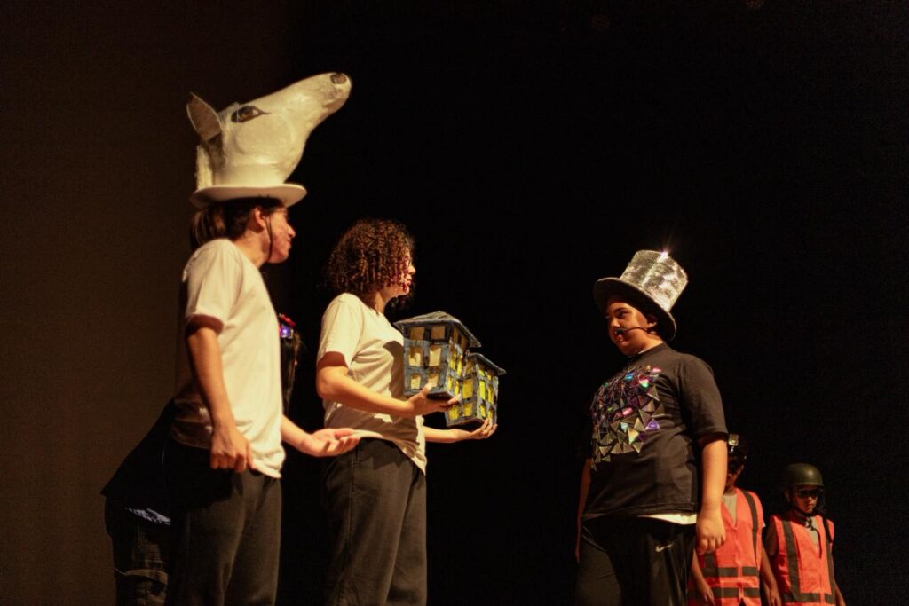 Aluno do curso há três anos, Raphael tem TEA (Transtorno do Espectro Autista) (na foto abaixo de cartola). De acordo com sua mãe adotiva, Valdirene Stella Sousa, ele tinha vontade de fazer teatro. “Ele se identifica muito com o teatro porque tem que usar fantasias. Desde que começou o curso, ele tem se dedicado muito”, conta a mãe.