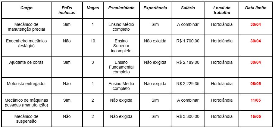 Confira abaixo os requisitos, valores dos salários, locais de trabalho e as datas limites das 19 vagas de emprego divulgadas pelo PAT de Hortolândia: