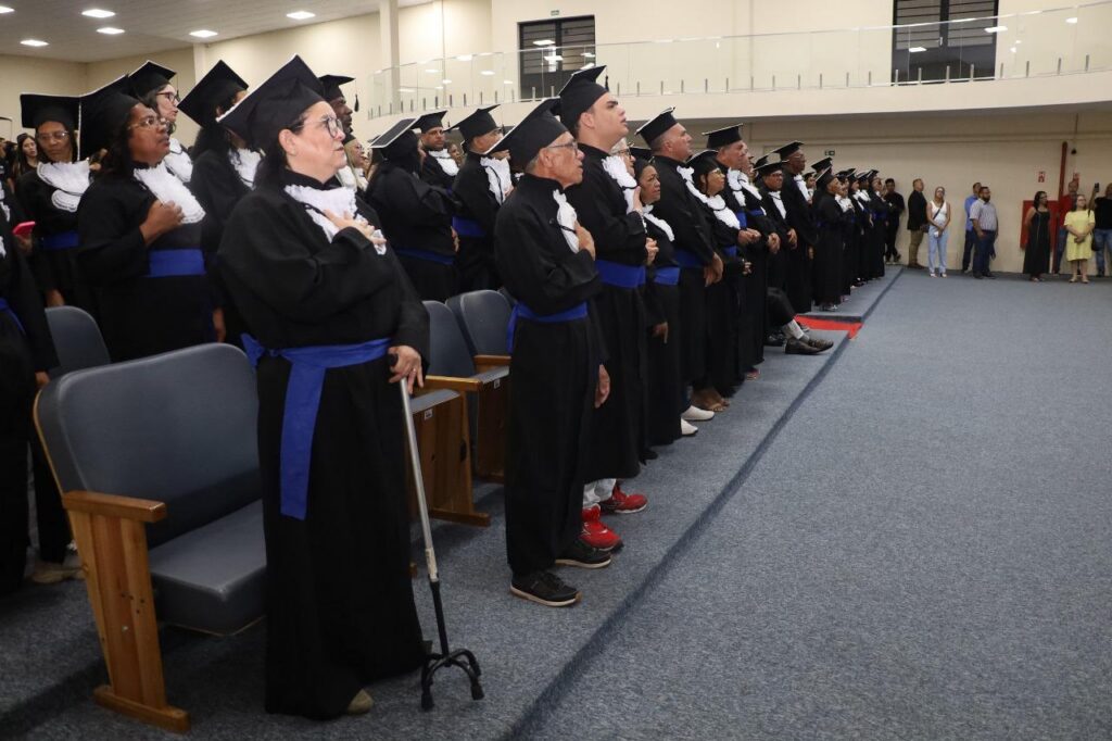 Cerca de 100 estudantes da EJA (Educação de Jovens e Adultos) em escolas polo da Prefeitura participaram, na noite desta quinta-feira (11/12), da cerimônia de formatura em quatro cursos profissionalizantes, ministrados pelo IFSP (Instituto Federal de São Paulo), campus Hortolândia, por meio do acordo de cooperação técnica e à adesão ao Pacto EJA (Pacto Nacional pela Superação do Analfabetismo e Qualificação na Educação de Jovens e Adultos). A cerimônia, realizada no auditório da Câmara Municipal, contou com apresentações, exibição de vídeos dos estudantes e momentos de celebração que reforçaram a importância dessa conquista para a trajetória de cada formando.