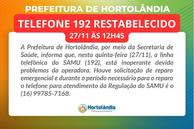 A Prefeitura de Hortolândia, por meio da Secretaria de Saúde, informa que, nesta quinta-feira (27/12), o reparo emergencial solicitado para a linha telefônica do SAMU…