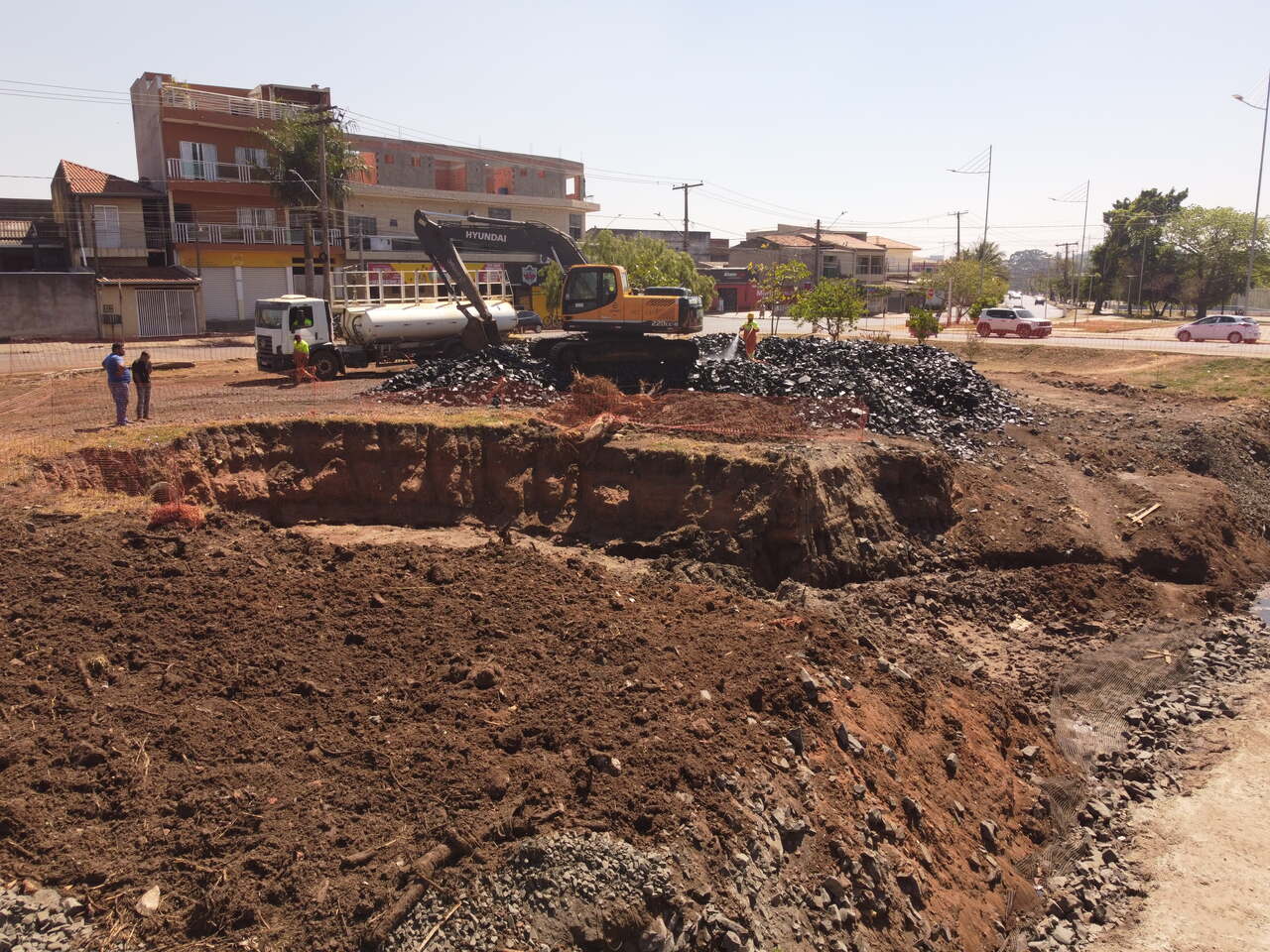 Empresa contratada pela Prefeitura coloca material de pedras no fundo do canal que será implantado para o córrego que passa ao lado da EMEF Tarsila…