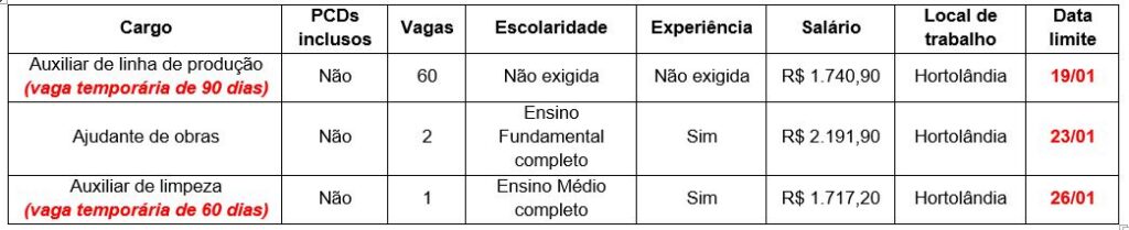 Uma opção para quem procura emprego é trabalho temporário. O Posto de Atendimento ao Trabalhador (PAT) de Hortolândia, órgão da Prefeitura, está com 61 vagas desse tipo. Destas, 60 são para auxiliar de linha de produção (pelo período de 90 dias) e uma para auxiliar de limpeza (pelo período de 60 dias). Há ainda duas vagas de ajudante de obras, que não são temporárias.