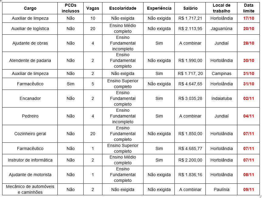 Além dessas vagas, o PAT de Hortolândia disponibiliza outras 70 vagas, com destaque para auxiliar de logística (20 vagas), cozinheiro geral (20 vagas) e auxiliar de limpeza (10 vagas). Confira as 75 vagas de emprego oferecidas no quadro abaixo.