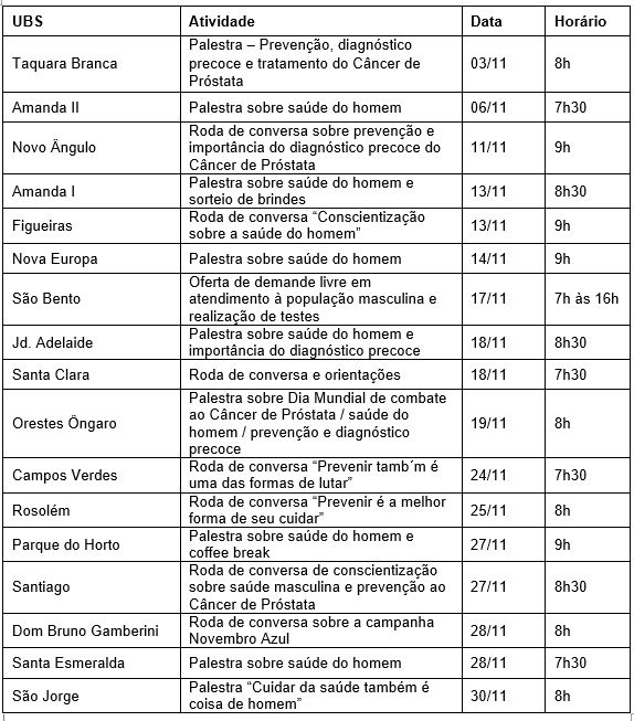 Saúde é também coisa de homem. É por isso que a Prefeitura de Hortolândia promove a campanha Novembro Azul. O objetivo é conscientizar a população masculina sobre a importância do autocuidado, com foco na prevenção e diagnóstico precoce do Câncer de Próstata. A Secretaria de Saúde realiza atividades nas UBSs (Unidades Básicas de Saúde) durante este mês (confira abaixo a programação).
